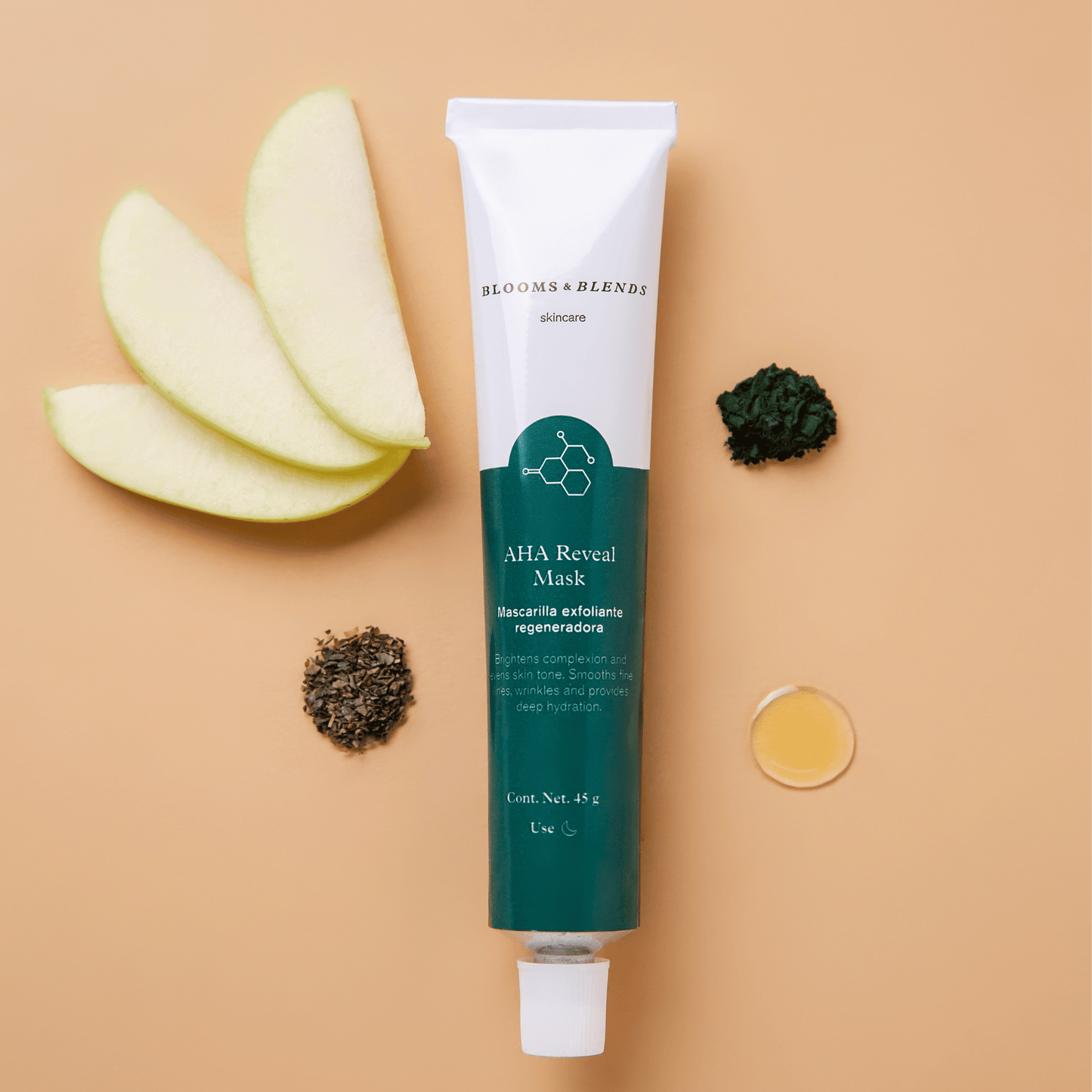 Agua, hidrolato de caléndula (Calendula officinallis), aceite de argán (Argania spinosa), aceite de semilla de uva (Vitis vinifera), cetearil olivato olivato de sorbitán, AHA´s de manzana (ácido málico, extracto de manzana (Pyrus Malus), ácido glicólico, ácido láctico, ácido cítrico), pulpa de manzana en polvo (Pyrus malus), espirulina en polvo (Arthrospira platensis), extracto de té verde (Camellis sinensis), extracto de gingko biloba (Gingko biloba), extracto de hammamelis (Hammamelis virginiana), extracto de aloe vera (Aloe berbadensis), ácido hialurónico, cardomomo en polvo (Elletaria cardomomum), polvo de achicoria (Chicorium intybus), polvo de raíz de malvavisco (Althaea officinalis), maíz en polvo (Zea mays), aceite de hemp (Cannabis sativa), tocoferol, inulina de agave (Agave tequilana), ácido caprilhidroxámico, caprilato de glicerilo, alcohol bencílico, ácido benzoico, ácido dihydroxyacético, tocoferol, goma xantana, aceite esencial de sándalo (Santalum álbum), aceite esencial de palo rosa (Aniba rosaeodora), aceite esencial de bergamota (Citrus bergamia), aceite esencial de rosa.